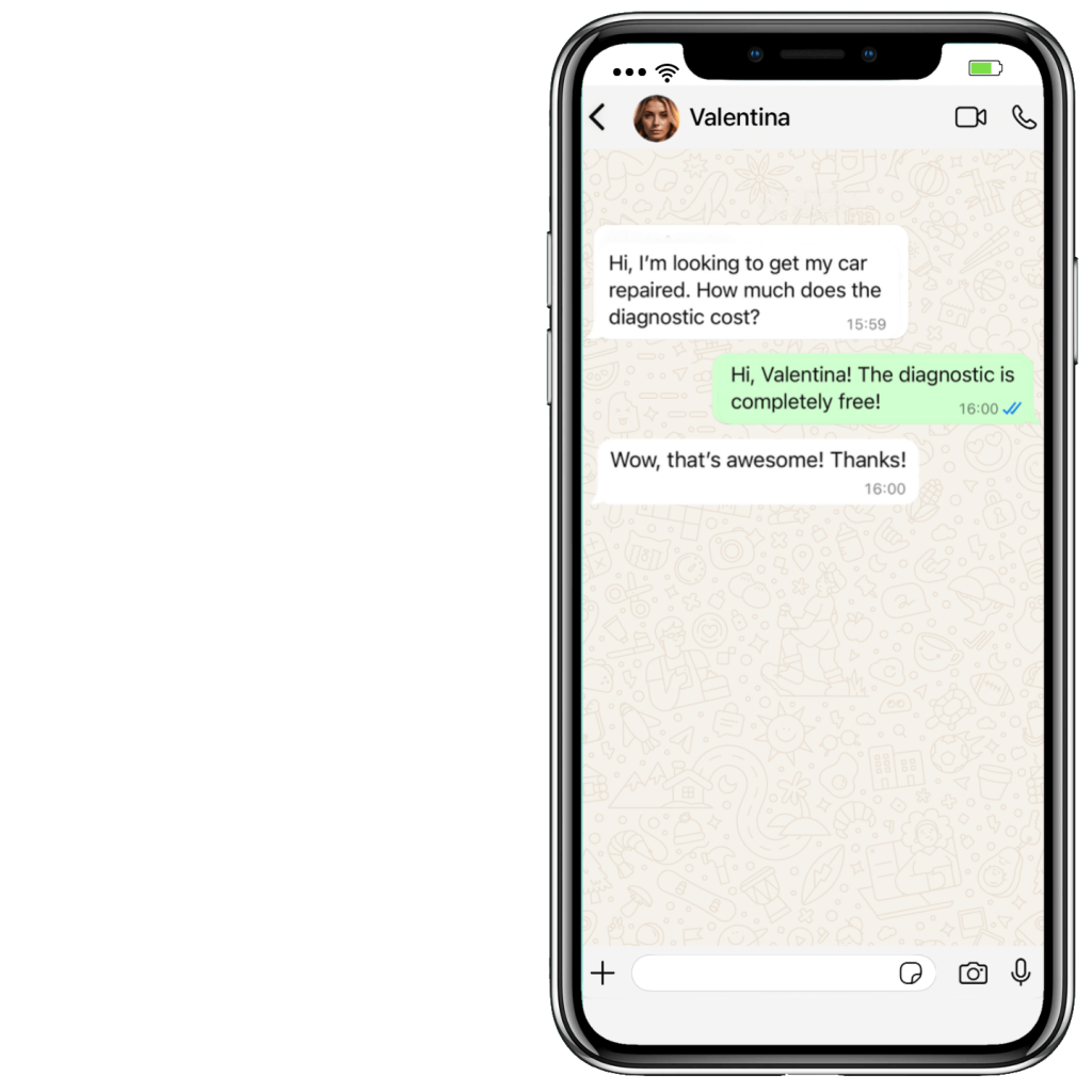 When clicking the button in the corner of the site, a chat window appears that fully imitates WhatsApp, where the manager asks to describe the issue. Only after the first real message is sent does the visitor get redirected to the mobile app, where further communication with the consultant takes place.